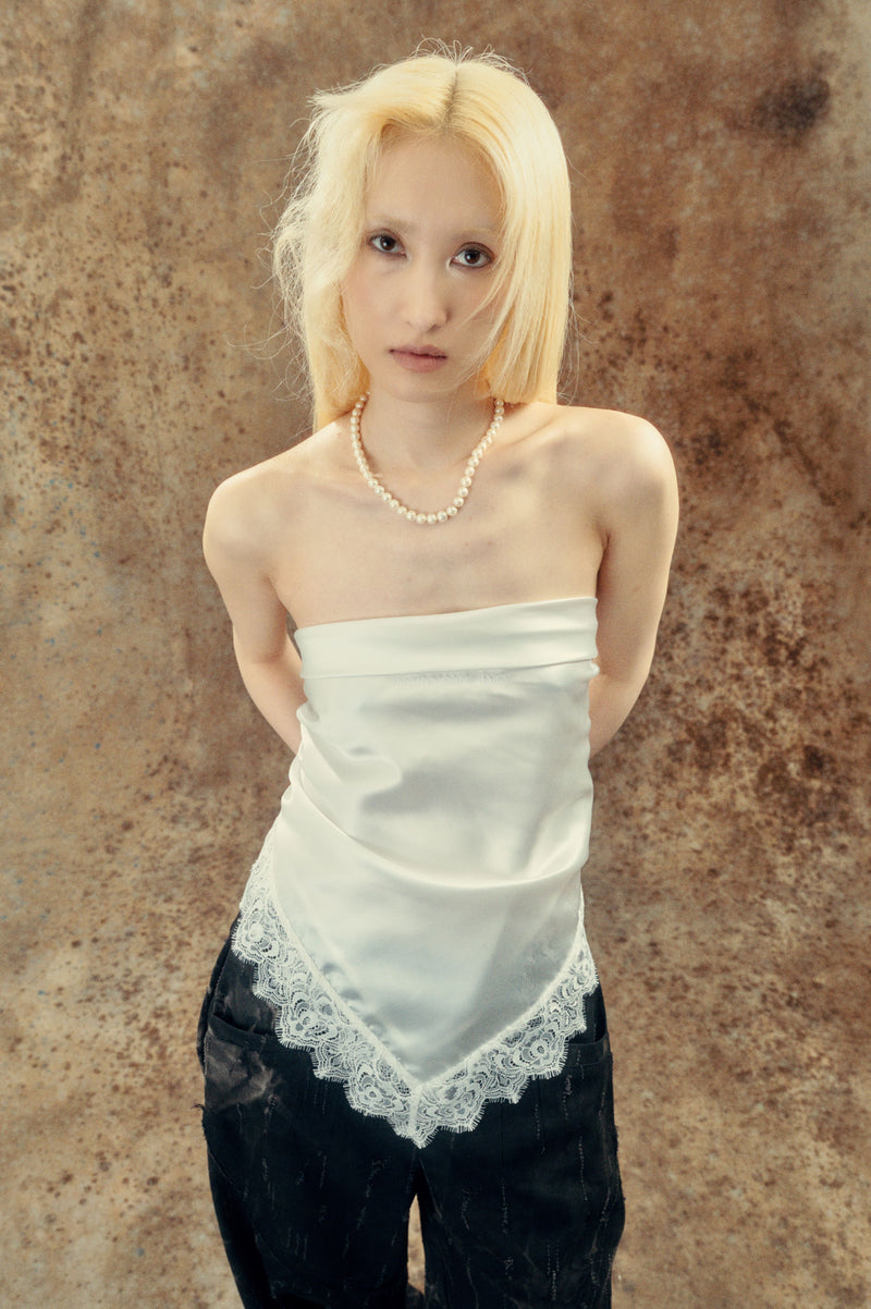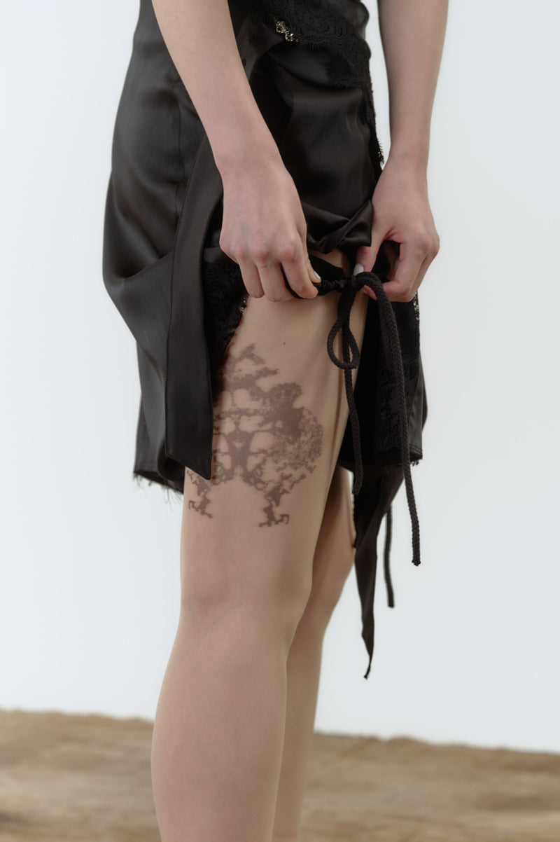 亮面涼感布料優雅優雅,自由調節的繩結象徵柔軟中的主體意志,古典細節如過量的微光,為炎夏帶來寧靜卻溫柔的存在。 花語的餘燼-棉料舒適涼爽,前底層絲網印花與背後大面積的花海影像形成對比,宛如灰燼之後悄然盛開的記憶。 包含本季品牌包含與綻放之間的平衡。 輕柔透明感與夏季的清爽材質組成的飾品單品,既可裝飾於衣身,也可獨立成章。 品牌青少年結合可客製化的細節設計,配上蕾絲的靜謐語言,在灰燼中的優雅誕生。