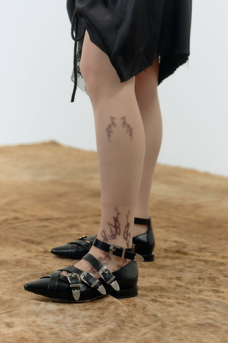 重工水洗與刷破處理,形塑出瘀青般的歷史感。 彎刀式寬褲剪裁溫柔而堅定,帶有不奢華的自由氣質,口袋與剪接細節低調卻別具設計感,記錄著在傷痕中活著的姿勢。 靈魂之紋-底層的刺青圖樣融合水仙與蕾絲,宛如將花語刻入肌膚,薄如記憶的質感中,藏著品牌核心的純粹與信仰,是重生靈魂的另一層肌膚。