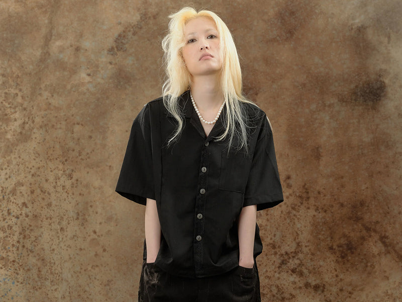 剪斷接線刻意不收邊,扮演被時間概覽後的真實情景。 親膚的黑色布料與金屬玻璃的釦子細節交相輝映,如沉睡中灰燼的餐桌,靜靜訴說著舊日的優雅與重生。 來自日本的布料鬆軟高級又精緻以外,布料織紋組織展現出清晰密度的重力,突顯這款襯衫的低調與優雅細節。
