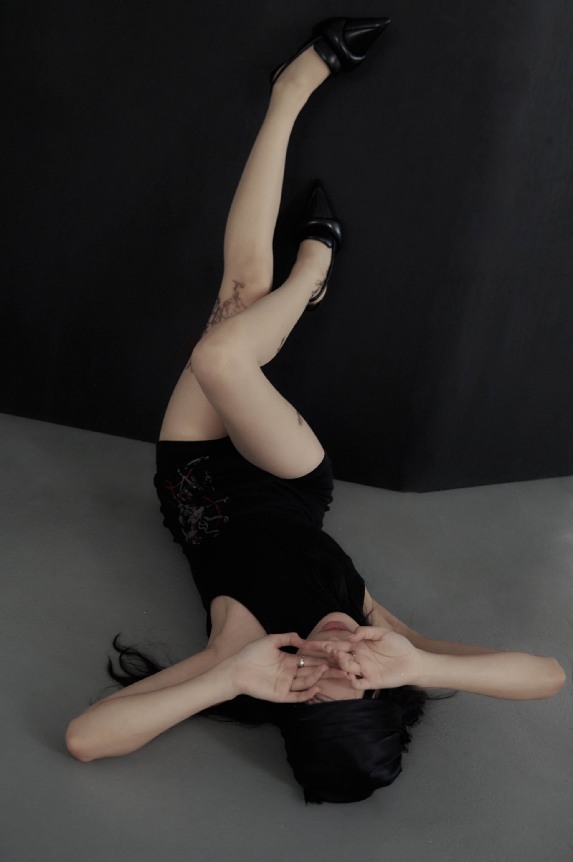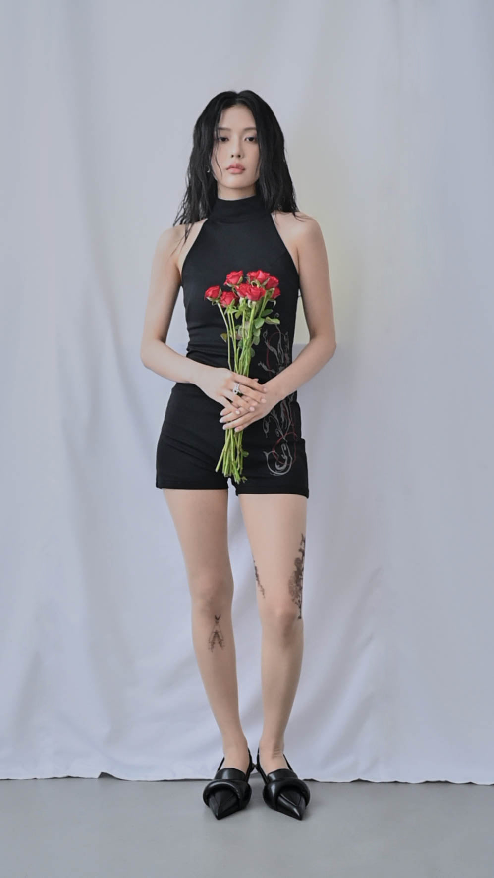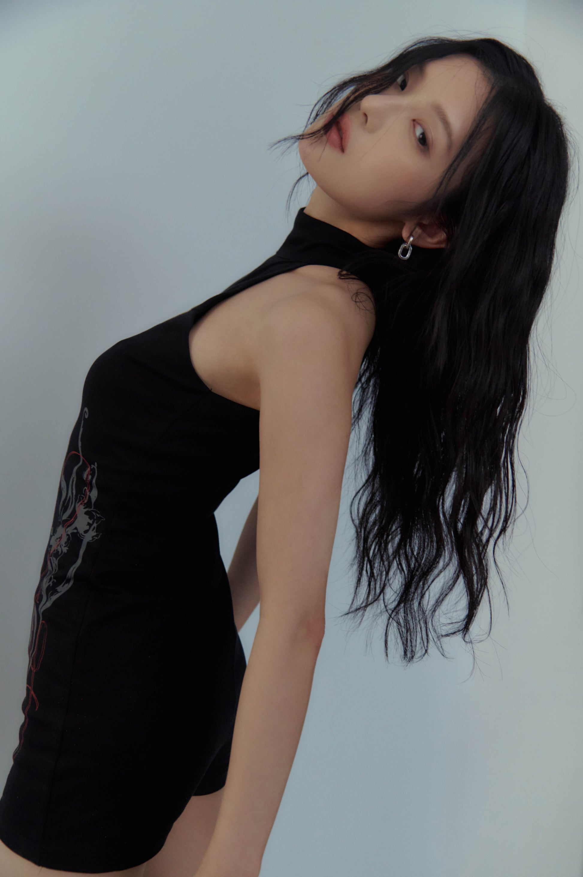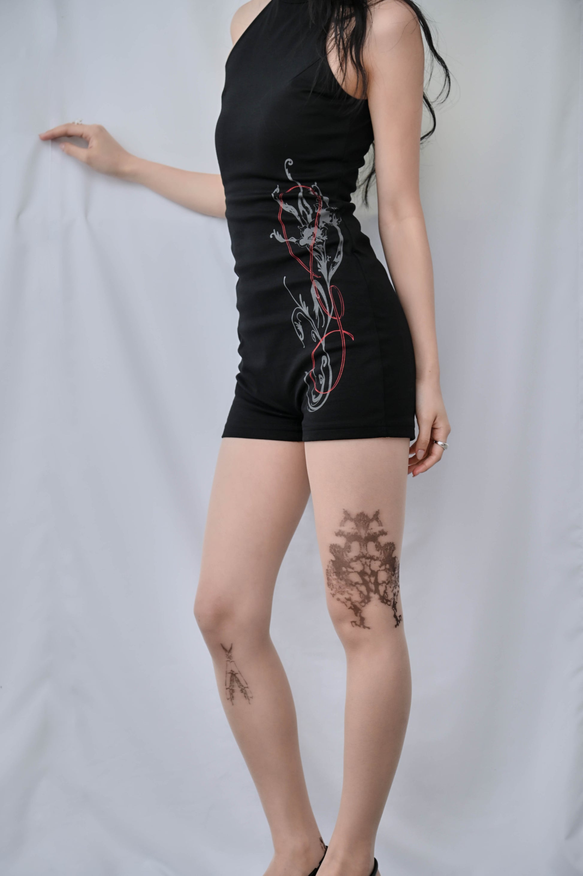 側邊平面設計師手繪圖樣,以細緻線條呈現,如同花瓣延展於身側,低調卻具有辨識度,是這件連身衣最安靜卻最迷人的細節。