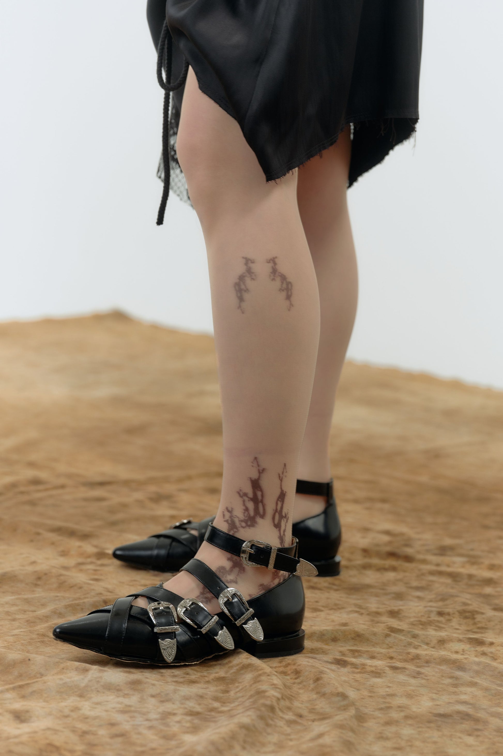 這款絲襪將「記憶」與「靈魂」化為紋樣,將水仙花與蕾絲圖騰以刺青般的視覺語言刻劃在肌膚之上,極薄透膚的質地如同記憶的影子,帶著詩意的柔軟,靜靜貼合每一步輕盈腳步,是重生後的靈魂外衣。